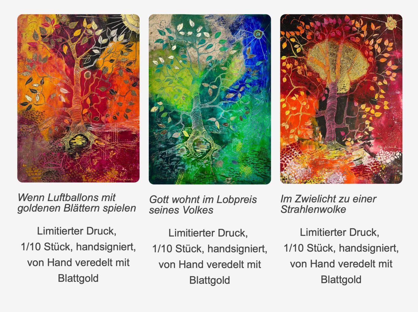 Die Werke erscheinen nahezu in Originalgröße und werden von mir von Hand mit Blattgold veredelt.