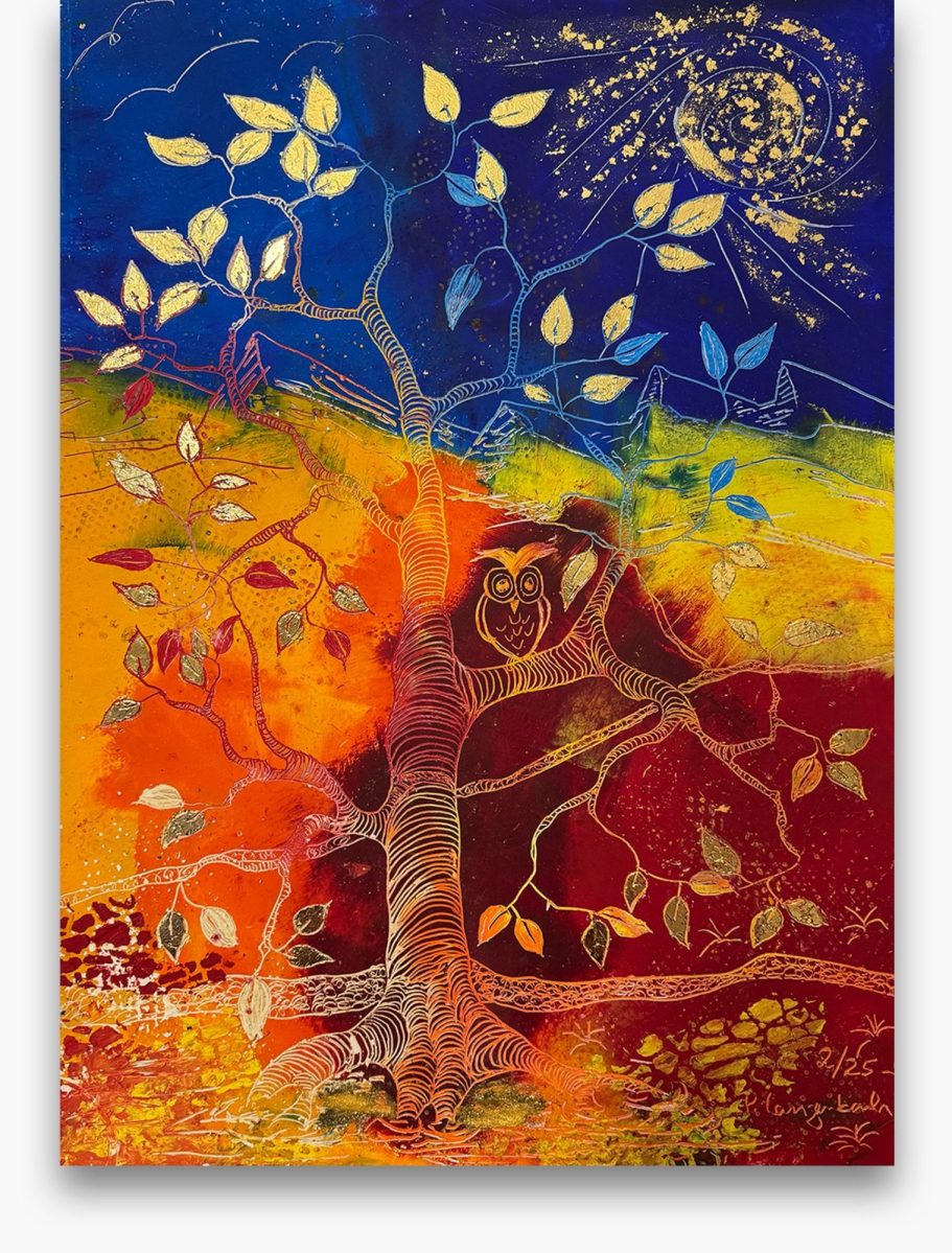 Der Silbermond verfängt sichim Lebensbaum. Und Farbteppiche prägen die Atmosphäre. Verlauf Dich nicht mit Deinen Blicken.
