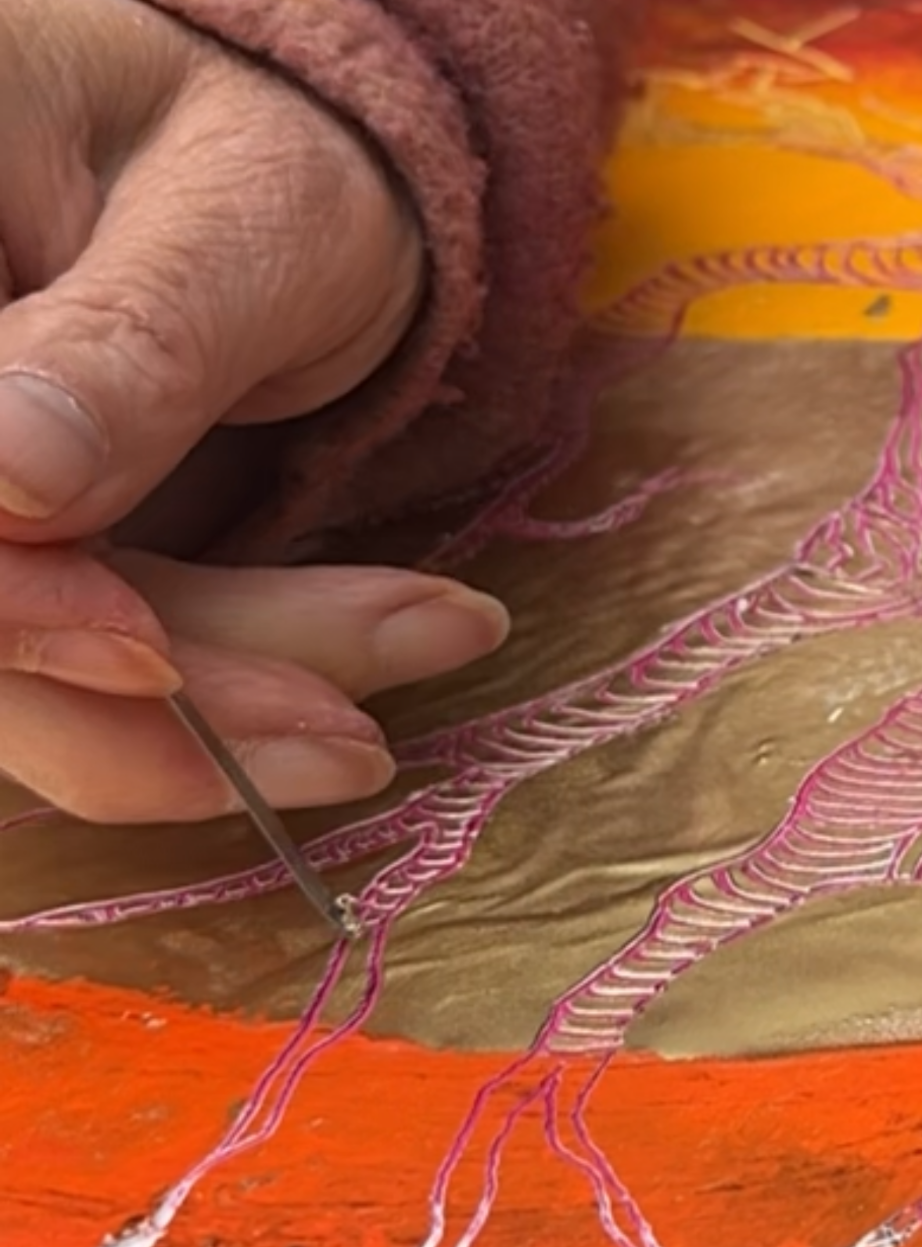 Jede Farbe wird frisch mit dem Wachs-Harz-Medium angerührt und in vielen Schichten mit Malmessern, Rakeln oder Spachteln aufgetragen. Nach der Trocknung können Schichten freigelegt, Linien eingeritzt, Elemente eingeprägt oder neue Farbebenen aufgetragen werden. So entsteht eine Bildtiefe, die nur dieses besondere Material ermöglicht.